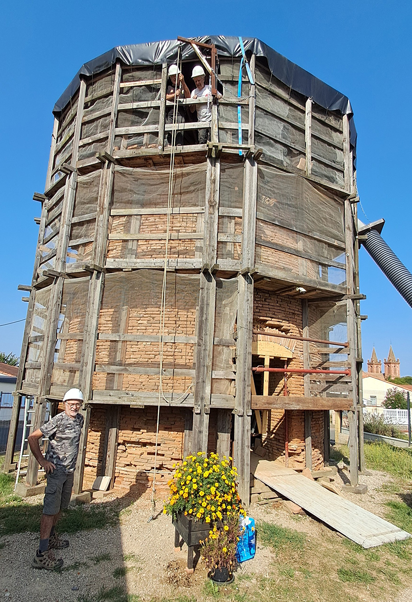 Affrontant des conditions climatiques saisonnières nous sommes fin Novembre 2021 en passe de finir le premier étage de l’échafaudage en bois ceinturant le moulin :